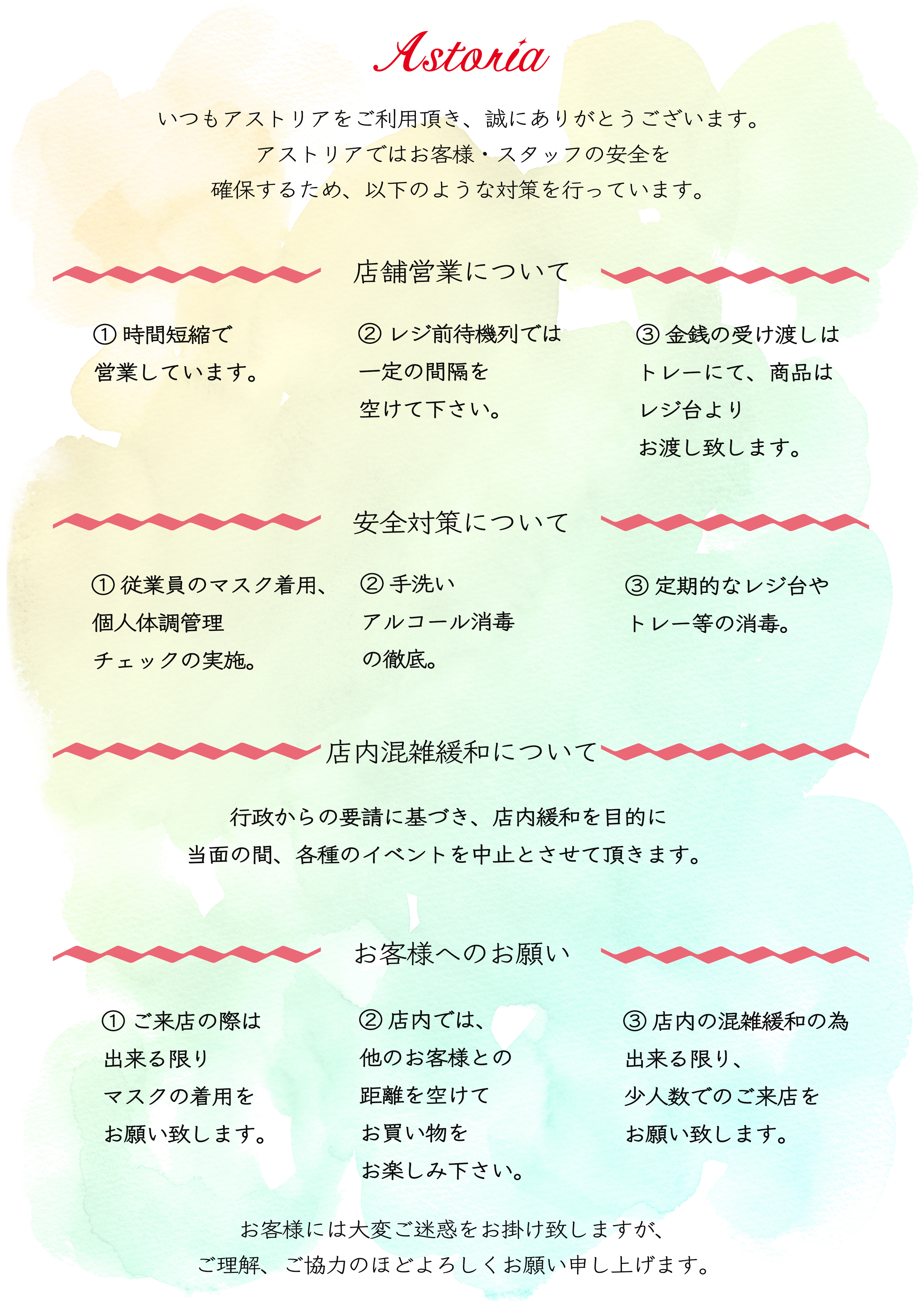 アストリアでは、お客様と従業員の感染症予防に努めながらの営業に取り組んでまいります。何卒ご協力をお願い申し上げます。